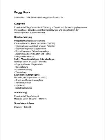 Examinierte Pflegefachkraft mit Erfahrung auf einer Intensivstation sucht eine Tätigkeit im Bereich medizinische Fachangestellte in Teilzeit.