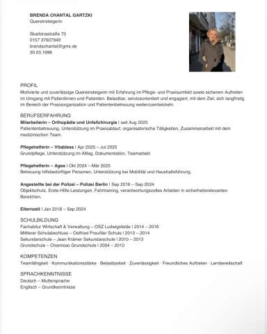 Ich heiße Janine und bin 20 Jahre alt. Als motivierte Quereinsteigerin mit einem Jahr Erfahrung in der Anmeldung in der Orthopädie und Unfallchirurgie möchte ich meine organisatorischen Fähigkeiten und mein medizinisches Grundverständnis in einem Team einbringen. Während meiner bisherigen Tätigkeit war ich für die Patientenanmeldung, Terminplanung, Telefonkoordination sowie die administrative Betreuung von Patientenakten verantwortlich. Dabei konnte ich nicht nur mein Organisationstalent unter Beweis stellen, sondern auch den sensiblen Umgang mit Patientinnen und Patienten schätzen und vertiefen. Der direkte Kontakt zu Menschen und die Arbeit in einem medizinischen Umfeld bereiten mir große Freude. Ich bin sehr daran interessiert, meine Kenntnisse weiter auszubauen und durch praxisnahe Erfahrungen zur professionellen Patientenbetreuung in einer Praxis beizutragen. Zuverlässigkeit, Teamfähigkeit und eine schnelle Auffassungsgabe zählen zu meinen Stärken.